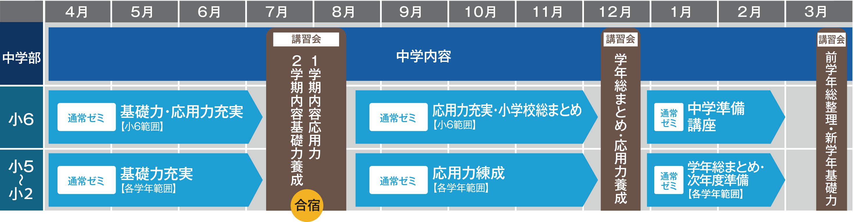 高校入試で頻繁に取り上げられる重要単元は、ゼミや講習会で重点的に学習する年間カリキュラムになっています。